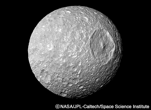 スター・ウォーズと言えば宇宙要塞「デス・スター」はもっともインパクトのある天体だが、映画ができて3年後の1980年、惑星探査機ボイジャーによってデス・スターそっくりの天体の写真が撮られた。土星の衛星ミマスだ。直径は400kmぐらいの小さな天体だが巨大クレーター・ハーシェルが三分の一を占め、真中の山は標高約7キロにもなる。アンバランスな天体である。