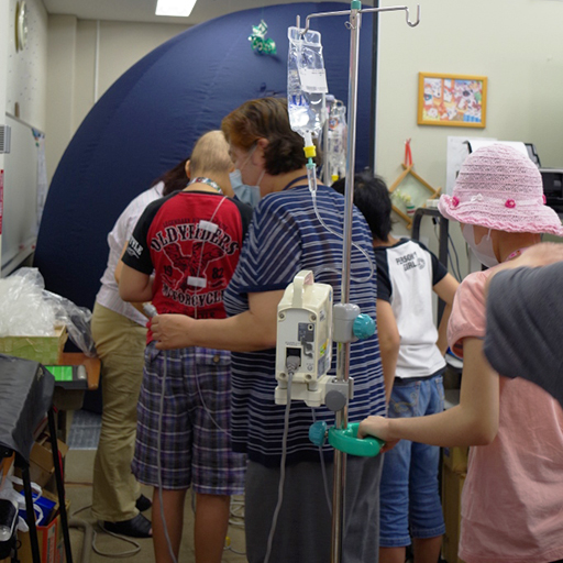 6月5日、山梨県中央市にある山梨大学付属病院の院内学級でプラネタリウムの設置が始まった。高橋さんとボランティアの大学生二人でシートをひき、投影用機材とパソコンをつないだら、エアドームの布を広げて扇風機で風を送る。ドームがみるみる膨らんで直径4m、高さ2.5mのプラネタリウムができあがると、興味津々で見ていたあゆちゃんが「やったー」と声をあげる。あゆちゃんは去年のプラネタリウムの時は体調が悪く、参加できなかった。だから今日が楽しみで一番乗りでやってきた。同病院には血液疾患や心臓・腎臓など様々な病気で入院している子供たちがいて、入院が半年を超える子供が三分の一を占めるそうだ。病院は生活の場でもある。なかなか遊びに行くことができない子供たちにとって今日は特別な、待ちに待った日なのだ。