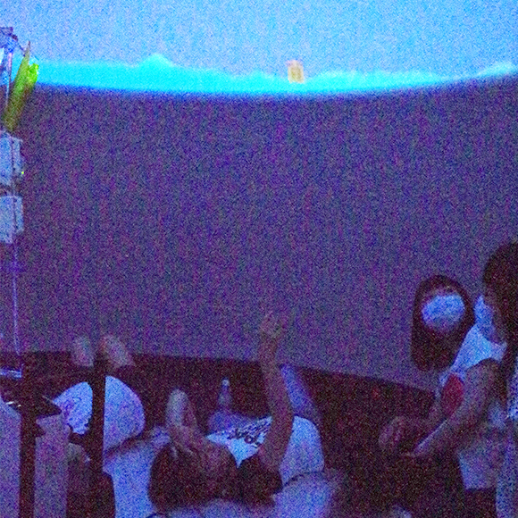 まもなく点滴をつけた子供達がやってきて、お母さんや先生たちと一緒に10人ほどでドームに入る。ドームの中は別世界。「こんな部屋があったらいいなぁ」とりさちゃんがつぶやく。高橋さんは「好きな姿勢で見ていいよ~」と優しく声をかける。まずは見慣れた甲府の夕焼けから。太陽が沈んでいく方向を当てたり、今、見ごろの一番星(金星)と二番星(木星)や星座の見つけ方を聞いたり。高橋さんは子供たちの星座を聞いて一緒に星座を探したり、ふともらした言葉を受け止めたり、子供たちの反応に柔軟に合わせながらプログラムを進めていく。