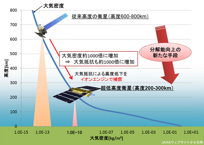 「つばめ」プロジェクトマネージャであるJAXA佐々木雅範さんによれば、低高度衛星に立ちはだかる大きなハードルは二つ。「大気の抵抗」と「原子状酸素」だ。200~300kmの超低高度は、従来の地球観測衛星が飛ぶ高度600~800kmに比べて大気の密度が約1000倍に増加する。それは大気抵抗が1000倍に増加することを意味する。放っておけば衛星は数日から2か月ほどで高度が下がり、大気圏に突入して燃え尽きてしまう。だから衛星に搭載した燃料を噴射して高度を保たなければならない。