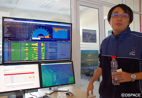 アルマの運用現場には石井さんのように世界から集まった天文学者が10人ほどいて(サンティアゴにいる交代要員も含めると約30人)、1日3シフト24時間体制で観測運用に当たっている。「観測の実行はもちろん、観測中のリアルタイムのモニタリングも重要です。正しく目標の天体をとらえているか、十分な感度を満たしているか、個々の望遠鏡から出力される信号がそろっているかなど、逐一チェックし、問題があれば対処していきます」。8時間以上のシフト中、1~2時間おきに観測テーマを入れ替えていくので、観測中は気が抜けない。