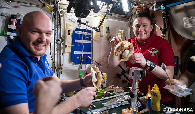 油井飛行士によると、大量の荷物の中でも生鮮食品が本当に嬉しいらしい。「匂いや色、五感を通して、有難みがわかるんです。ISSの中は白とか青とか機械的な色がほとんど。植物的な色は稀です。だから生鮮食料品で柑橘類を見つけた時がミッション中、一番嬉しい顔をしていたんじゃないですかね(笑)」