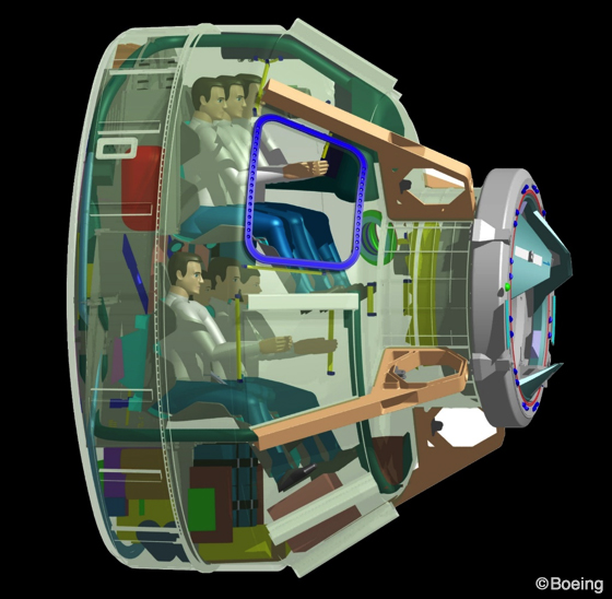 一方、ボーイング社のスターライナーは直径約4.5m、高さ約5m、人が乗るカプセルの容積11m3で、クルードラゴンより平べったい恰好をしている。カプセルは最大10回、再利用できる。船内は革新的な無溶接設計でボーイングの787機等で採用されたLED照明「Sky Lighting」を装備。開放感のある空間を作り出しているとのこと。無線インターネットが備えられているほか、乗務員用にタブレット型の操作パネルが採用されている。