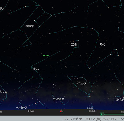 5月24日20時30分(東京)の北の空。きりん座が大きく首を伸ばしているのがわかる。予想放射点は+印付近。(アストロアーツ・ステラナビゲータで作成)