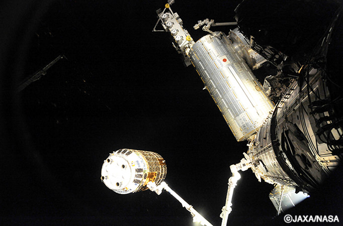 筑波宇宙センターの運用管制室でスタッフが固唾を飲んで見守るなか、18日にはNASAのニコール・ストット飛行士がロボットアームでこうのとりをキャッチし、無事にISSとのドッキングを果たした。