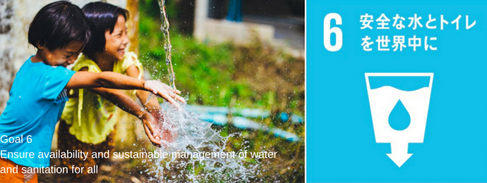 SDGs6は「全ての人に持続可能な水の使用と衛生設備(トイレ、下水道など)を保障する」が持続可能な開発目標として設定されている。(OXGENより)