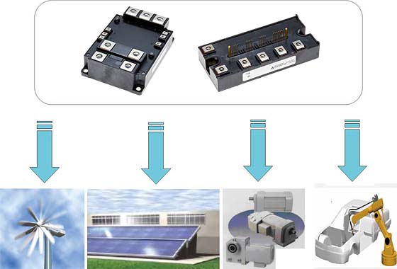 パワーモジュール(主力製品:IGBTチップ搭載モジュール/IPM)、大電力パワーデバイス、半導体センサー、トランジスタアレイ、HVIC