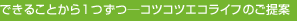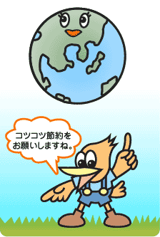 | ちょっとした暮らしのムダが、積もり積もって温室効果ガスとなるCO2(二酸化炭素など)の 排出を増やし、温室効果ガスとなって地球温暖化を引き起こしています。 地球温暖化による海面上昇や生態系の崩壊、異常気象などの深刻な状況を拡げないためには、 みんなが生活を見直し、小さなことからコツコツと節約に取り組むことが大切です。 あなたのために、そして未来のために。さぁ、いまから「コツコツエコライフ」はじめませんか。 |