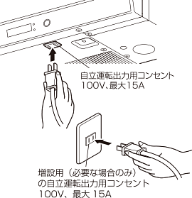 4. 自立運転で電気製品を使用した後は、電源プラグを自立運転出力用コンセント(必要な場合に別設置)から抜きます。