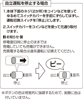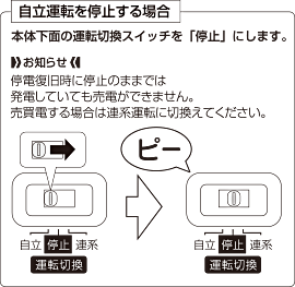 各製品機種により自立運転の切換え方法、及び操作ボタンが異なるため、取扱説明書に従ってお間違いのないよう操作をしてください。