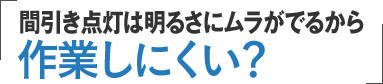 蛍光灯を間引くと明るさのムラがでます。 照明空間は設計された器具配置で適正照度に設定されていますので、節電のために間引くことは照度にばらつきが出て目が疲れ作業がしにくくなります。