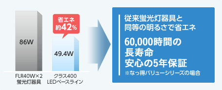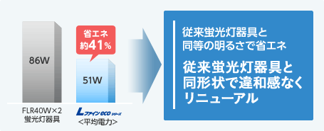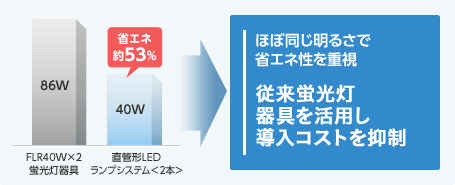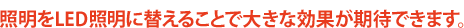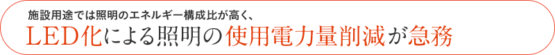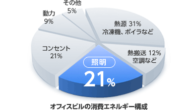 照明のエネルギー消費構成比はオフィスビルで21%、 店舗・商業施設で29%と非常に高く、 照明を消費電力量が少ないLEDに交換することが節電対策のポイントです。