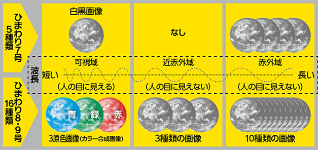 「ひまわり7号」は、30分に1回の観測でしたが、「ひまわり8・9号」では10分に1回観測することができます。また、ひまわり8号から日本列島付近については2.5分に1回の間隔でも観測が可能になりました。さらに、画像の種類が約3倍になることで、これまでは白黒画像でしたが、「ひまわり8・9号」ではカラー画像の作成も可能になりました。