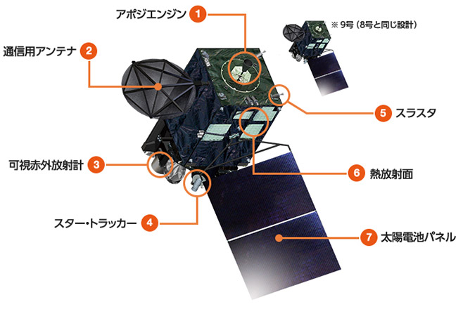 | 打上げ | 8号:2014年10月7日・9号:2016年11月2日 打上げロケット/H-ⅡA 衛星バス/DS2000 |