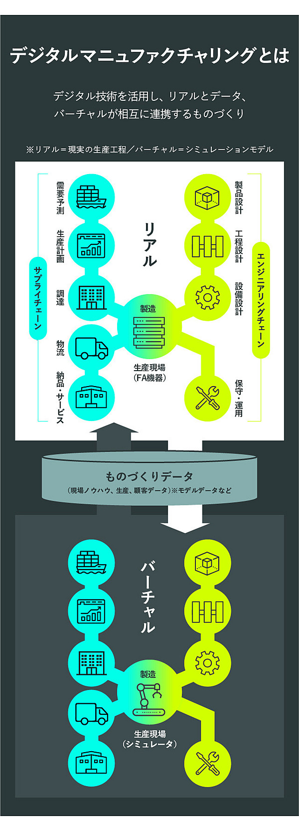 その実現の鍵を握るのが「デジタルマニュファクチャリング」。生産現場にデジタル・テクノロジーを組み込み、生産工程の効率化や最適化を図ることを指す言葉だ。