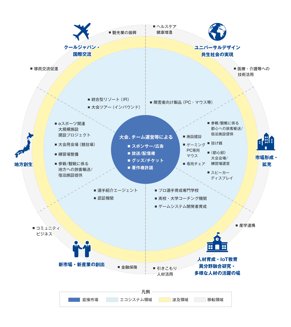 具体的には、イベントのチケット収入やプロチーム、プロeスポーツプレーヤーに対するスポンサー収入などコアとなる直接市場だけではなく、周辺産業を含めて2850億〜3250億円と予測しました。内訳は、直接市場が600〜700億円、キーボードなどの関連機器メーカーやイベント開催時の旅客輸送や宿泊施設などサポート機関からなるエコシステム領域が650〜750億円、さらにはエコシステム領域の経済活動が影響を与える波及領域が1600〜1800億円としました。