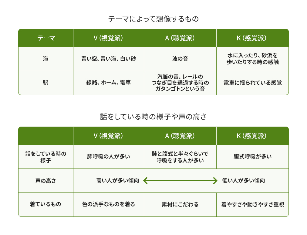 次に「駅」だったらどれでしょう。(1)「線路、ホーム、電車」、(2)「汽笛の音、レールのつなぎ目を通過するときのガタンゴトンという音」、(3)「電車に揺られている感覚」。こういう質問を重ねていって、選んだものに(1)が多ければVの視覚派、(2)が多ければAの聴覚派、(3)が多ければKの感覚派だと判断します。