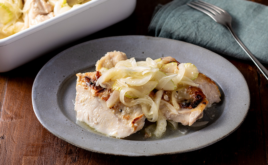 保存する清潔な保存容器にタマネギとセロリを適量広げ、その上に鶏肉を並べる。残りのタマネギとセロリ、汁気をすべて一緒に加え、全体に広げる。落としラップをして蓋をし、冷蔵庫で保存する。