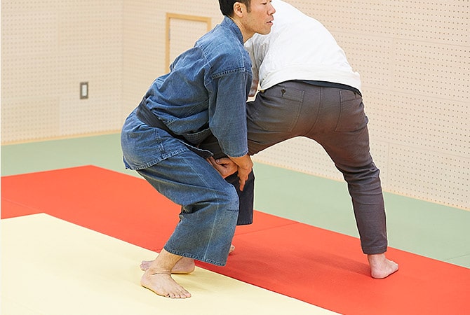 「仙骨を前に出す姿勢が上半身と下半身の連動性を強め、重心のある腰まわりが先行し、前に進む力が得られます。近いのは小便小僧のポーズ。だけど背中は弓ぞりにならないよう、背骨を如意棒のように上下に伸ばすイメージを持ってください。私はこれを“背中の軸取り”と呼んでいます。この姿勢を身に付ければ、たとえ腰骨に手をかけて後ろに引かれても力を入れずに前に進めますよ」