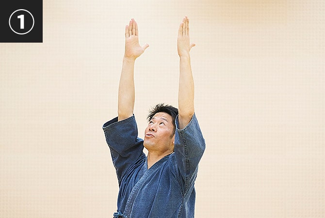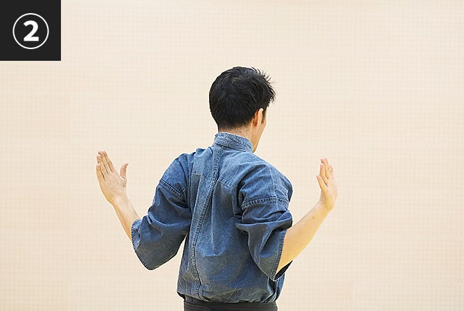 両手を上げ、体をアルファベットの「I」の状態に。そこから手のひらを外側に(小指を背中側に)返しながら肘を背中に寄せます。
