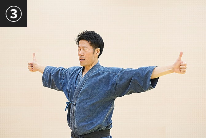 次に、手を左右に広げ、手と背中でアルファベットの「T」の状態を作ります。親指を上に立て、そこから正面に向け胸骨の働きを促します。