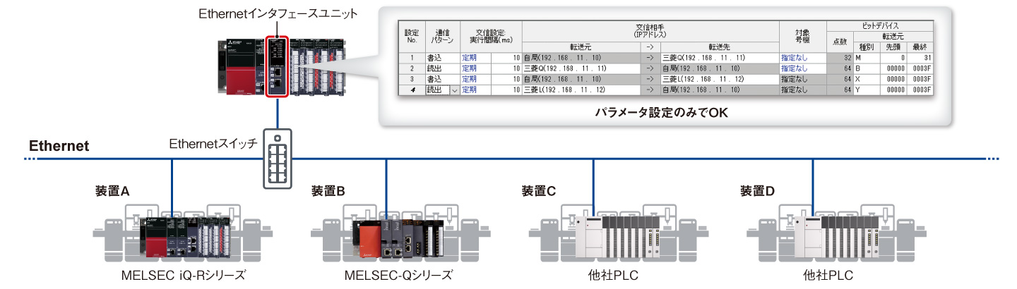 - Ethernetインタフェースユニットを使うと、パラメータ設定のみで、当社シーケンサだけでなく既設の他社PLCともデバイスデータのやり取りができます(シンプルCPU通信機能)*5