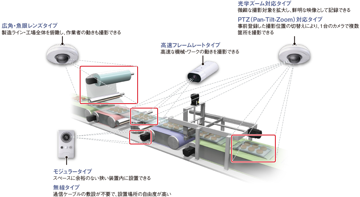 - 高速フレームレートFAカメラから、業界標準に対応した多彩なネットワークカメラまで対応しているので、撮影対象や設置環境に合わせたカメラを選択できます