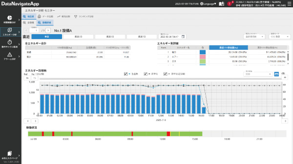 CO2排出量、エネルギー原単位、生産数、電力量を簡単に確認できます。電力量、生産数のデータを保存し、生産ラインや設備の工程ごとでエネルギーロス分析に活用できます。