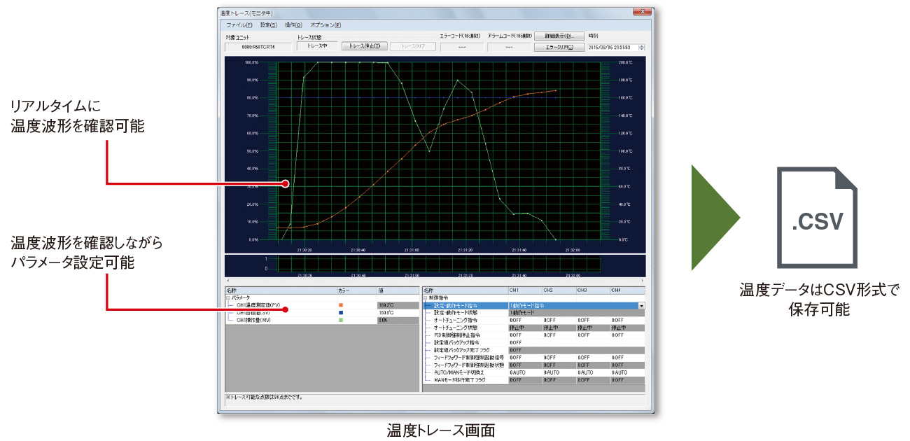 - トレースした温度はCSVファイルとしてエクスポートでき、様々な用途で使用できます