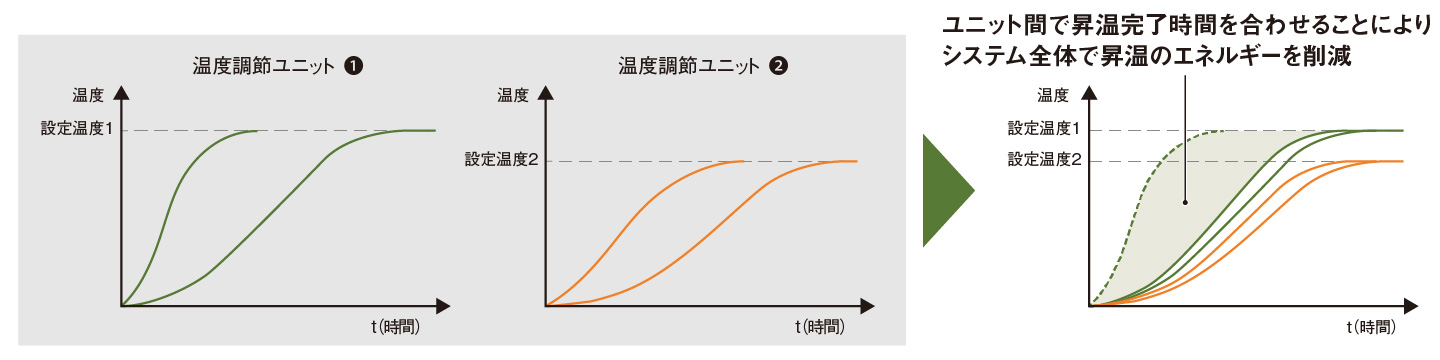 - 昇温到達時間は、最大64台のユニットを16グループまで分割して設定できます。そのため昇温到達時間を揃えられ、昇温時に発生する無駄なエネルギーをシステム全体で削減できます