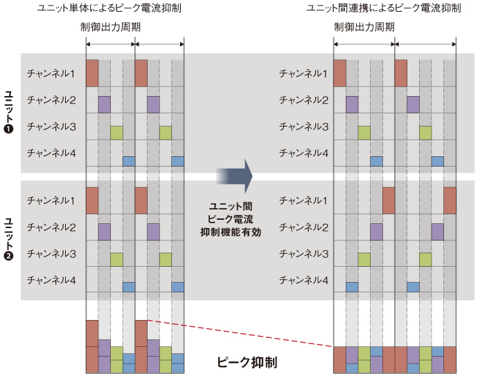 - トランジスタ出力のタイミングをずらすことで、ピーク電流を抑制します