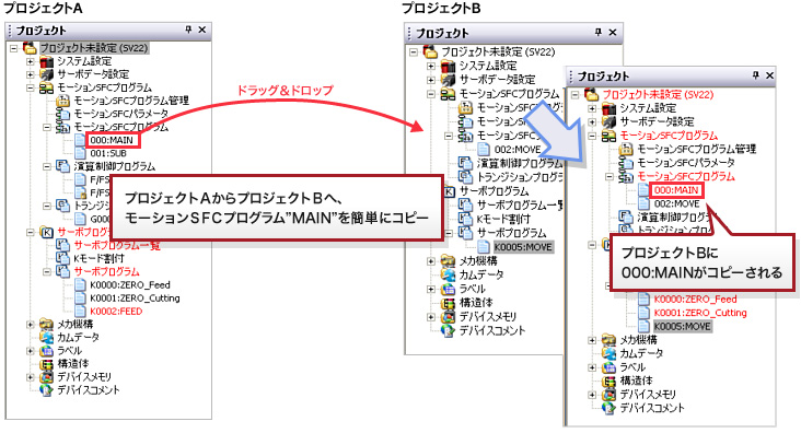 ドラッグ&ドロップで簡単に流用可能(演算制御プログラム/トランジションプログラム/サーボプログラム単位でも可能)