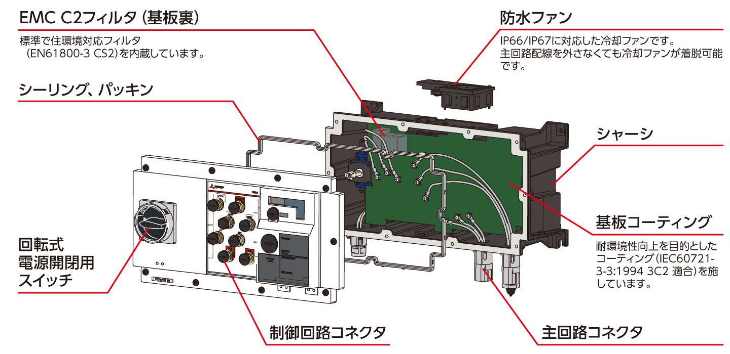 インバータの随所に防水・防塵に対応した設計 E800E800-EE800-SCE
