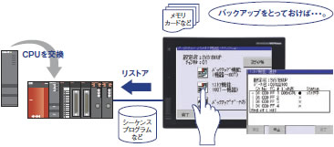| シーケンスプログラムやパラメータなどのデータをGOTのメモリカード・USBメモリにバックアップ。必要に応じてシーケンサに一括でリストア(書き戻し)が可能です。 |