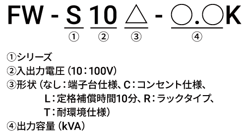 | ~1.5kVA | FW-S10-0.7K | 端子台 | 5分間 | タワー(横置き可能) |