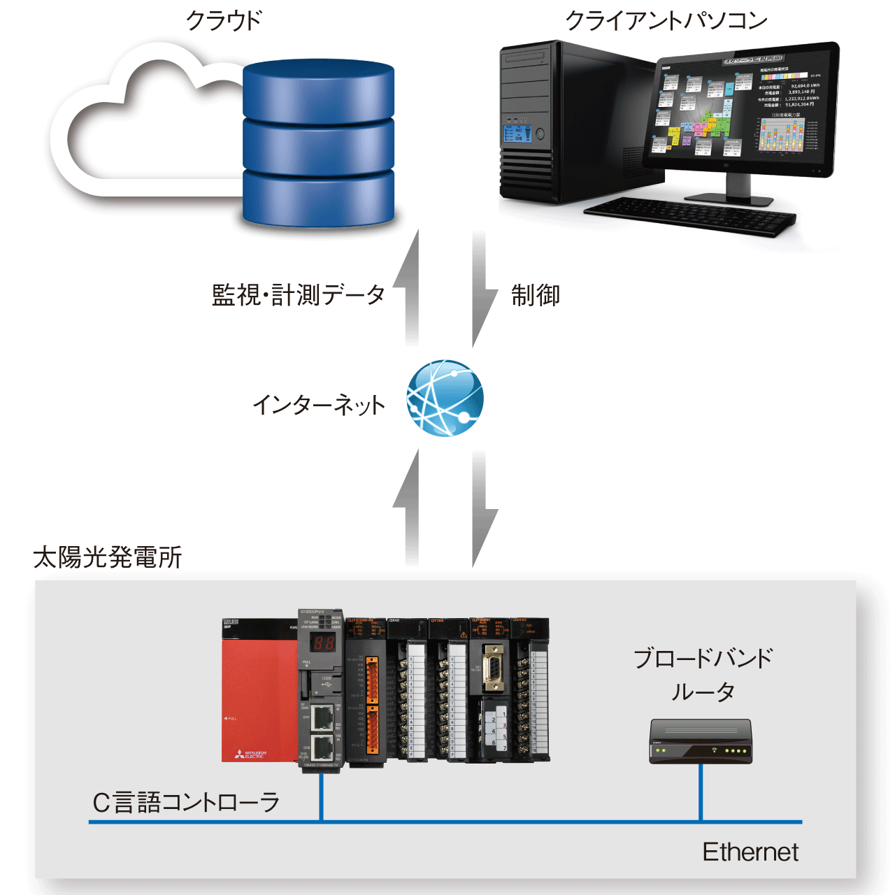 遠隔監視システムで最大50ユーザー、10ヶ所の発電所を一括で監視可能。発電所から収集した発電・異常情報は、クラウドサーバーで保持・管理されます。クラウドサーバーに接続するだけでデータを確認できるため、専用ソフトウェアをインストールする必要はありません。発電所設備管理・監視の工数削減と、発電設備の早期復旧による売電損失の最小化に貢献します。