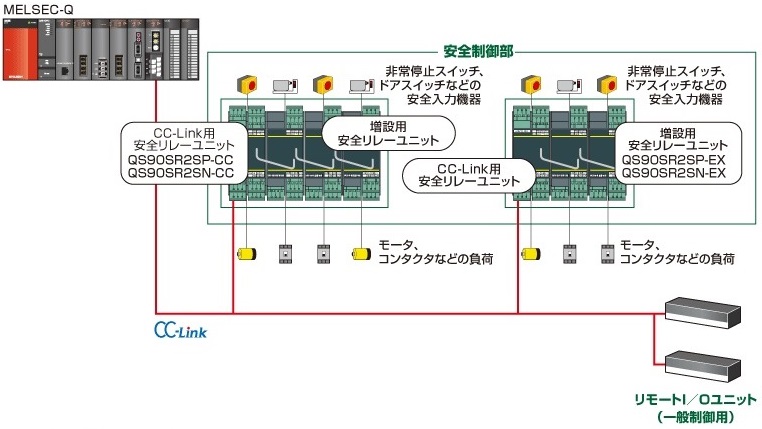 安全リレーユニットをMELSEC-Qシリーズ用ベースユニットまたはCC-Linkに装着・接続することで、既存のMELSECシーケンサに安全制御を容易に追加できます。