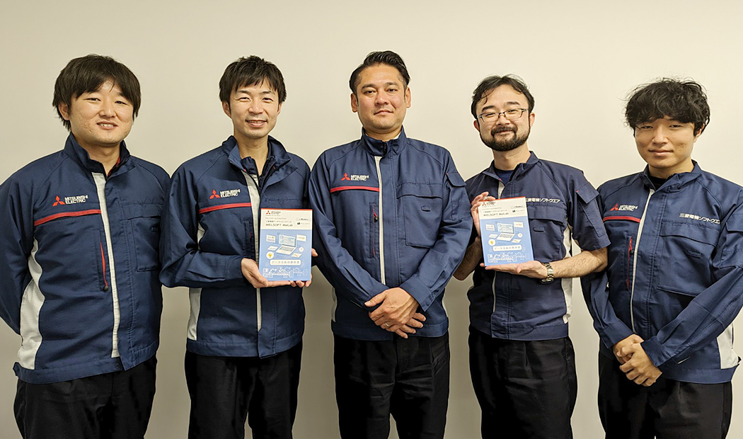 左から、開発チームのリーダーを務めた三菱電機 名古屋製作所 ソフトウエアシステム部 ソリューション三課 専任の江口貴紀、サブリーダーを務めた同 専任の中野翔太、営業担当の三菱電機 名古屋製作所 営業部 ソフトウエア課 専任の石原善弘、実際に開発を行った三菱電機ソフトウエア FAエンジニアリング開発第二部 FA統合ソフトウエア開発第一課 グループリーダーの山田哲也、同 主査の伊藤大