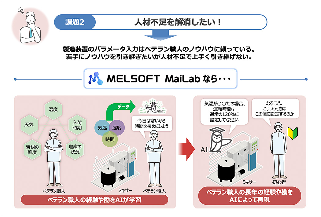 もう一つの代表的な用途が「人材不足への対応」だ。食品業界では扱う食材の特性上、気温や湿度によって加工の制御内容が大きく変わる場合が多い。前提条件が大きく変わる場合は最適な設定値を定めることが非常に難しく、熟練技術者が製造装置のパラメータを適宜変更しながら商品の品質を一定に保っている。このノウハウは明文化されていないケースが大半で、若手技術者への技能継承にも時間がかかる。