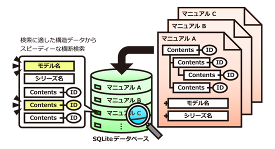 e-Manualファイルは、仕様・機能などの説明文書以外に、対象となる機種やシリーズ名、製品名、またマニュアルのバージョン情報などの属性情報が付与されており、マニュアルの原稿データは検索に適した構造にするとともに、WindowsやAndroid、iOSなどのOS(Operating System)に関係なく共有できるようにSQLiteデータベースを採用して、コンテンツをデータベース化して収録している。