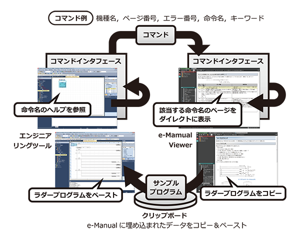 e-Manual Viewerは、他アプリケーションからの要求に応えるためのコマンドインタフェース機能を備えている。そのため、エンジニアリングツール上からe-Manual Viewer内の全マニュアル情報(命令仕様やツールの操作方法など)を必要に応じて検索して表示させることができる。これによって、従来メーカー側が作成していたエンジニアリングツール専用のヘルプファイルは不要となり、ヘルプファイル作成の工数が削減できる。
