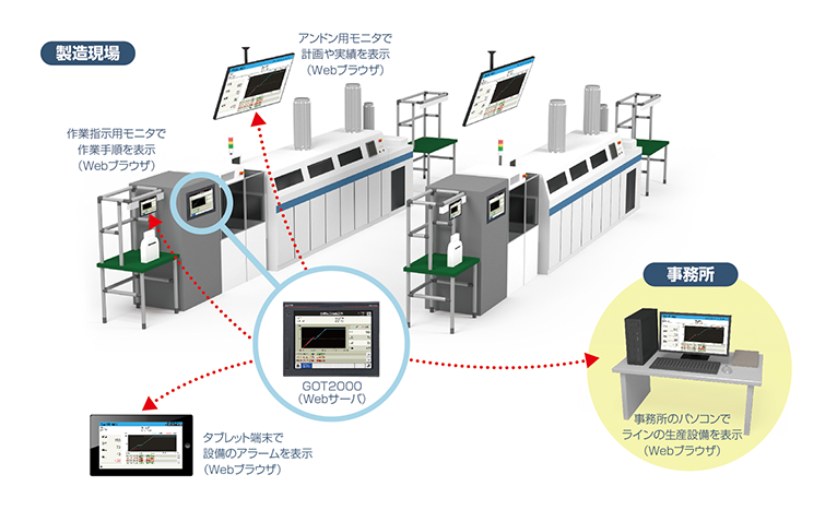 - 表示器 “GOT(Graphic Operation Terminal)” がシーケンサ、又は、接点入力から生産実績を取得し、アンドン用モニタなどに生産状況を表示するシステムを提供する。