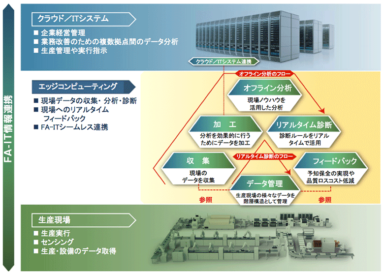 三菱電機は、FA−IT統合ソリューション “ e−F@ctory ” によって、開発・生産・保守全般にわたるトータルコストを削減する仕組みを2003年から提唱してきた。そのアーキテクチャの特徴は、生産現場とITシステムとの中間にエッジコンピューティング層を設けていることである。近年、生産現場のIoT(Internet of Things)化やAI(Artificial Intelligence)活用が注目されていることから、それに応えるためエッジコンピューティング製品を開発中である。この製品群は、ソフトウェアプラットフォーム “ Edgecross ” を採用した高速・高信頼の産業用PC “ MELIPC ” 、生産現場のデータをリアルタイム診断が可能なデータ分析ソフトウェア “ リアルタイムデータアナライザ ” 、生産現場の多様なデータの監視が可能なSCADA(Supervisory Control And Data Acquisition)ソフトウェア “ MC Works64エッジコンピューティングエディション ” で構成される。この製品群を活用することで、生産現場の設備から電流値・圧力などの現場のデータを収集・加工し、現場ノウハウを生かしてオフライン分析することで設備故障や品質悪化に影響するデータを特定し、予知保全や品質監視のための診断ルールを作成できる。この診断ルールを用いて、生産設備の運用時にリアルタイムにデータを収集・加工し、診断ルールへの適合性を判断することで、リアルタイムに予知保全や品質監視などを行う。これを生産現場や管理室などで監視することで、設備稼働率の向上や品質ロスコストの低減を図ることができる。