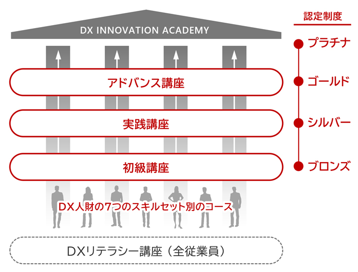 今回設立する「DXイノベーションアカデミー」は、当社グループにおけるDX人財のスキルセット※1に基づき、それぞれに必要な技術・知識・マインドセットを集中的に習得し、実践に活かすことができる学びの場を当社グループ内へ提供します。社内外講座を組み合わせた段階的な学習体系を整備することにより、既存のDX関連技術保有者およびDX関連業務従事者だけでなく、他業務からの職務転換者や新規入社者など、個々人の保有するスキルや知識レベルに応じた幅広い育成を実現するとともに、当社グループの全従業員を対象とした講座も設け、グループ一体となってDXを推進する風土を醸成します。加えて、最新技術の集中的な獲得・実践、新たな人財交流などの確立を狙いとして、早稲田大学をはじめとする大学・教育機関との産学連携も進めていきます。