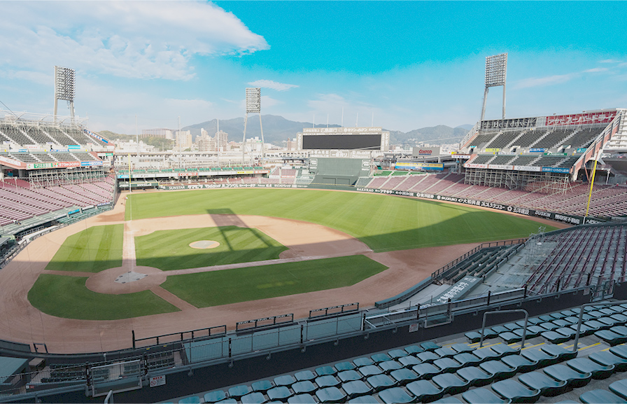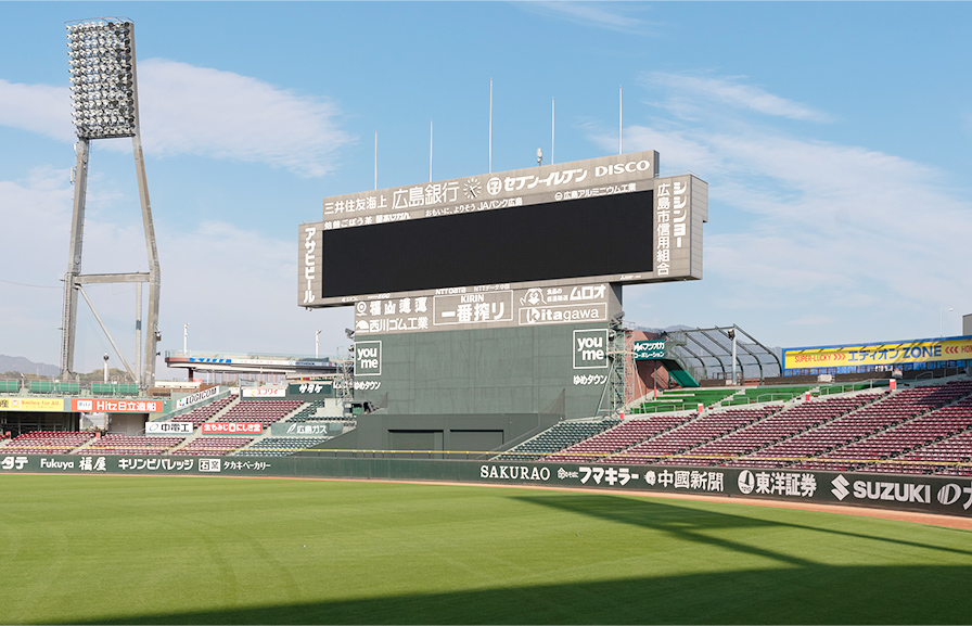 「MAZDA Zoom-Zoomスタジアム広島(略称:マツダスタジアム)」には、スコアボード向けとして、三菱電機製のオーロラビジョンが設置されています。長さ37.44m、高さ7.04mの全面フリーボード化された高解像度・高視野角のスクリーンは、迫力満点!画面上に多彩な映像を自由に配置して映し出すことで、白熱した試合を盛り上げています。