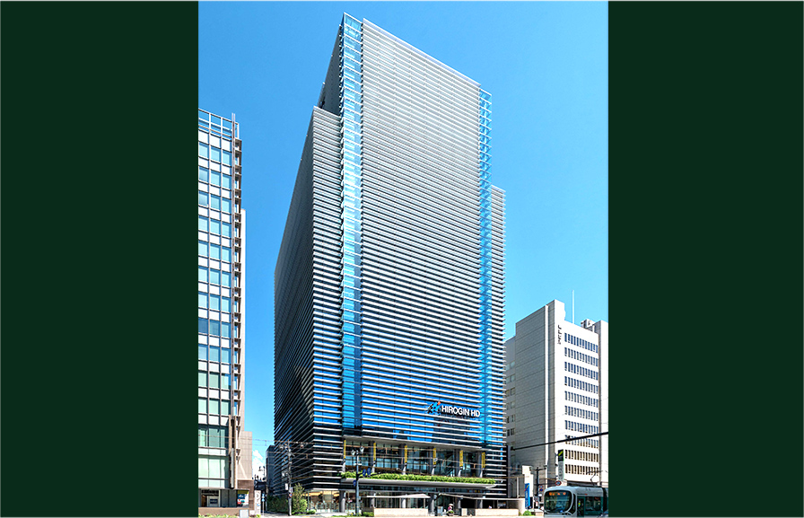 広島市中区に本店を置く広島銀行は、「ひろぎん」の通称で、地域に根ざした金融機関として親しまれています。2021年5月に、地上19階・地下1階の高さ約94mの高層の「ひろぎん」グループが入居する新本社が完成し、ビル内には三菱電機製のエレベーターが設置されています。