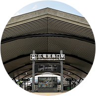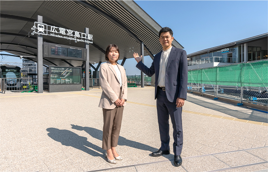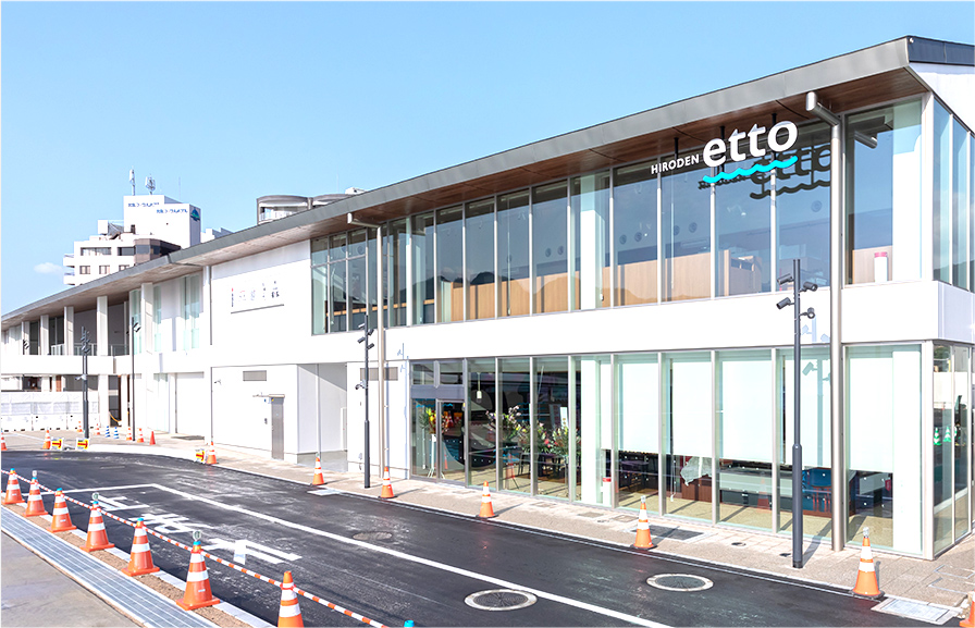 日本三景の一つとして、世界文化遺産にも登録された「宮島」。その宮島への玄関口となる広島電鉄の「広電宮島口駅」は、2022年7月にリニューアル。海側に近い場所に開放感あふれる新駅舎が完成し、宮島口の新たなシンボルとして活気あふれる拠点となっています。フェリーの旅客ターミナルに隣接しており、乗り換えもスムーズ。駅舎の隣には、ターミナルと直結した観光商業施設「etto(えっと)」が開業し、広島・瀬戸内のローカルグルメやスイーツ、おみやげ・雑貨などの店舗が集まる宮島の新名所として賑わっています。