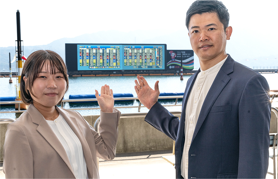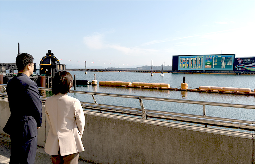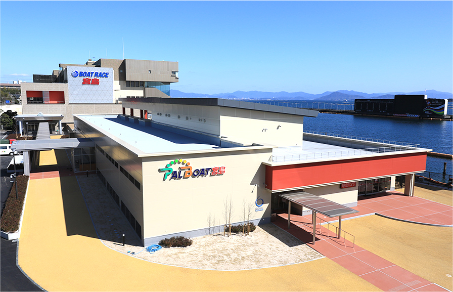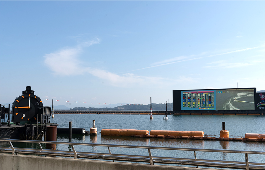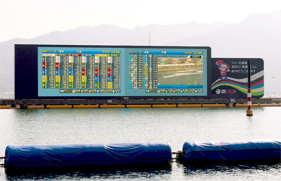 フェリー乗り場がある宮島口桟橋の隣には、瀬戸内海の海水を利用したコースを持つ競艇場「ボートレース宮島」があり、晴れた日には、世界遺産に指定された厳島神社の大鳥居を望むことができます。ここには、三菱電機製の高解像度フルカラーLED方式の屋外オーロラビジョンLED表示装置が導入されており、縦11.2m×横40.32mの2面構成の大型映像装置が、多彩なレース映像を表示しています。