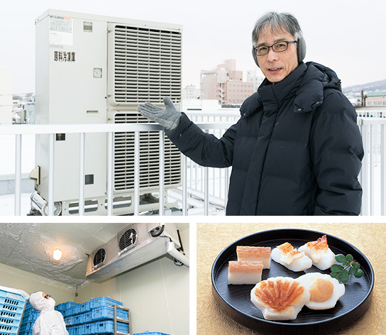 この工場の冷凍庫と冷蔵庫に三菱電機の製品が使用されています。スケトウダラなどの主原料は約-24℃、野菜や卵などの副原料は約7℃、製品貯蔵用は約-10℃と、材料や製品に応じて温度設定の異なる冷蔵庫、冷蔵庫を3つも使い分けるそうです。そういった厳重な温度管理の中で、新鮮な原材料を衛生的に加工することができています。
