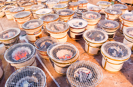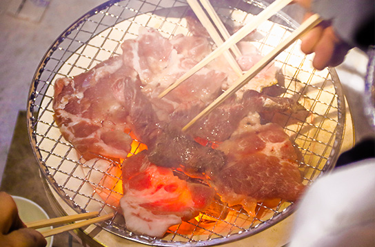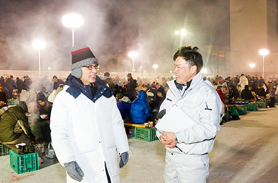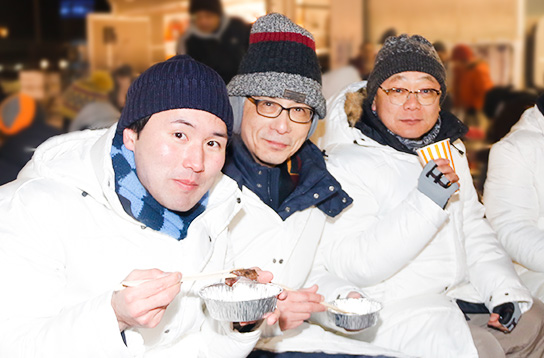 当日は午前中から準備が始まり、北見芸術文化ホール駐車場の特設会場にはたくさんのテントが設営されていきます。オープニングは17:30から。時間より少し前に会場に入りましたが、すでにたくさんの人で賑わっていて驚きました!450個以上の七輪が並び、焼肉の煙と香りがもうもうと立ち込め、いやが応にも食欲が刺激されます。氷点下の寒空で震えながら頬張る焼肉の美味しさと楽しさは格別!